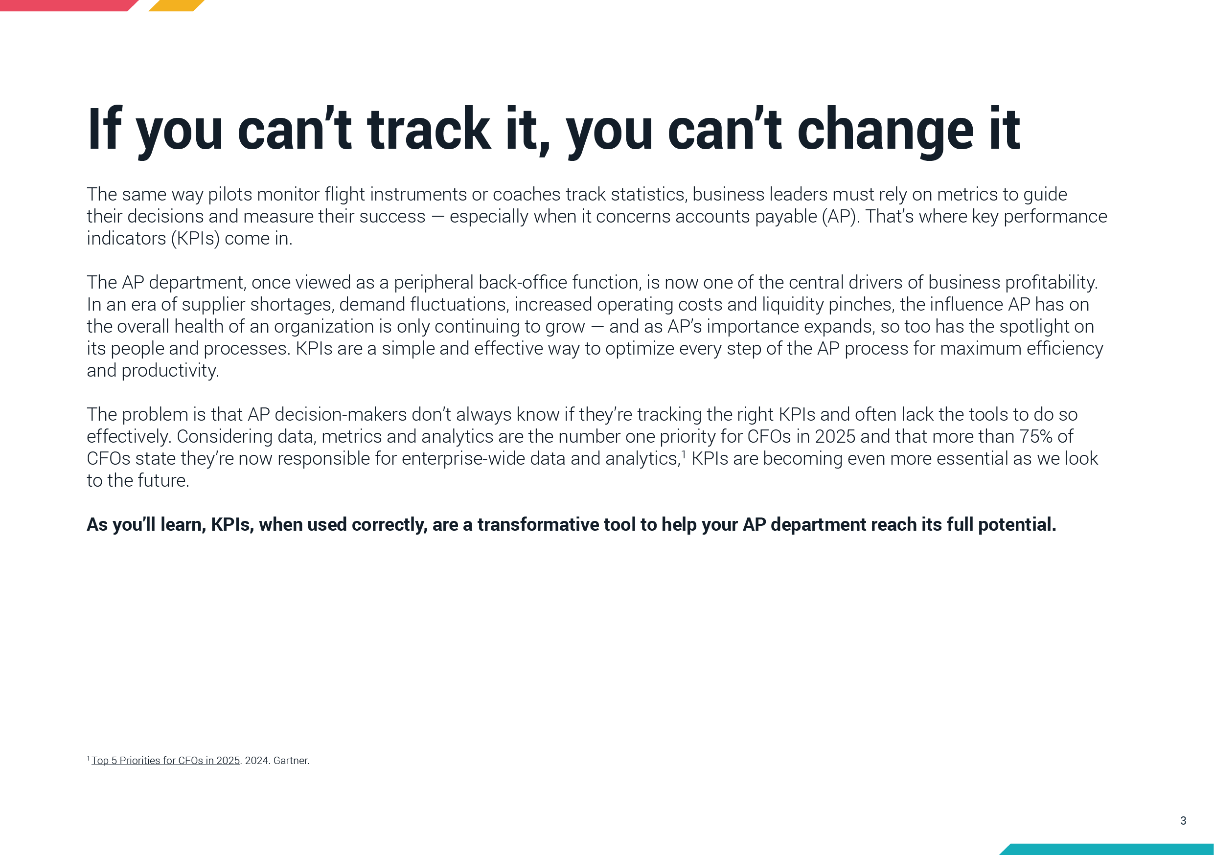 The same way pilots monitor flight instruments or coaches track statistics, business leaders must rely on metrics to guide their decisions and measure their success — especially when it concerns accounts payable (AP). That’s where key performance indicators (KPIs) come in. The AP department, once viewed as a peripheral back-office function, is now one of the central drivers of business profitability. In an era of supplier shortages, demand fluctuations, increased operating costs and liquidity pinches, the influence AP has on the overall health of an organization is only continuing to grow — and as AP’s importance expands, so too has the spotlight on its people and processes. KPIs are a simple and effective way to optimize every step of the AP process for maximum efficiency and productivity. The problem is that AP decision-makers don’t always know if they’re tracking the right KPIs and often lack the tools to do so effectively. Considering data, metrics and analytics are the number one priority for CFOs in 2025 and that more than 75% of CFOs state they’re now responsible for enterprise-wide data and analytics,1 KPIs are becoming even more essential as we look to the future