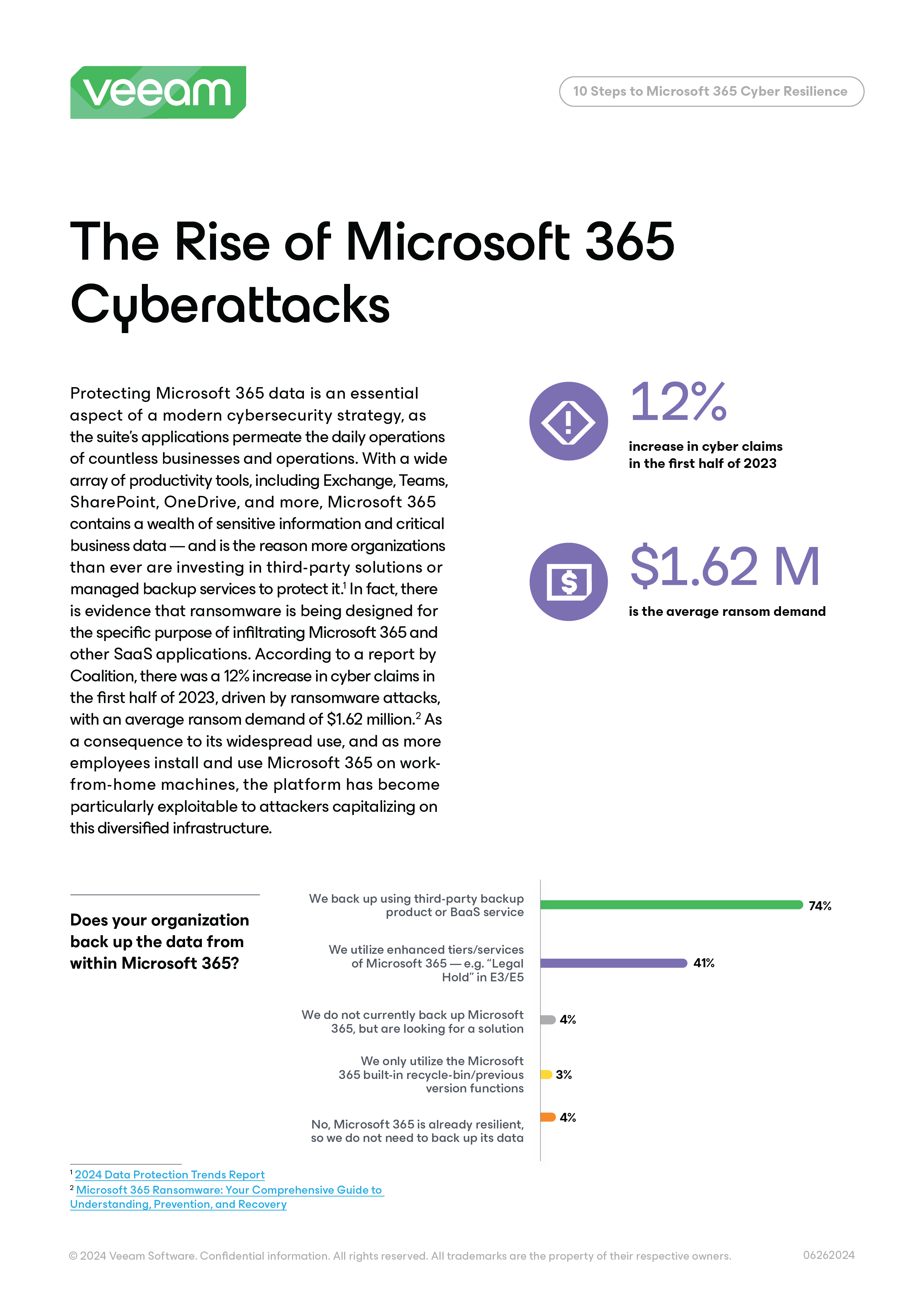 Protecting Microsoft 365 data is an essential aspect of a modern cybersecurity strategy, as the suite’s applications permeate the daily operations of countless businesses and operations. With a wide array of productivity tools, including Exchange, Teams, SharePoint, OneDrive, and more, Microsoft 365 contains a wealth of sensitive information and critical business data — and is the reason more organizations than ever are investing in third-party solutions or managed backup services to protect it.1 In fact, there is evidence that ransomware is being designed for the specific purpose of infiltrating Microsoft 365 and other SaaS applications.