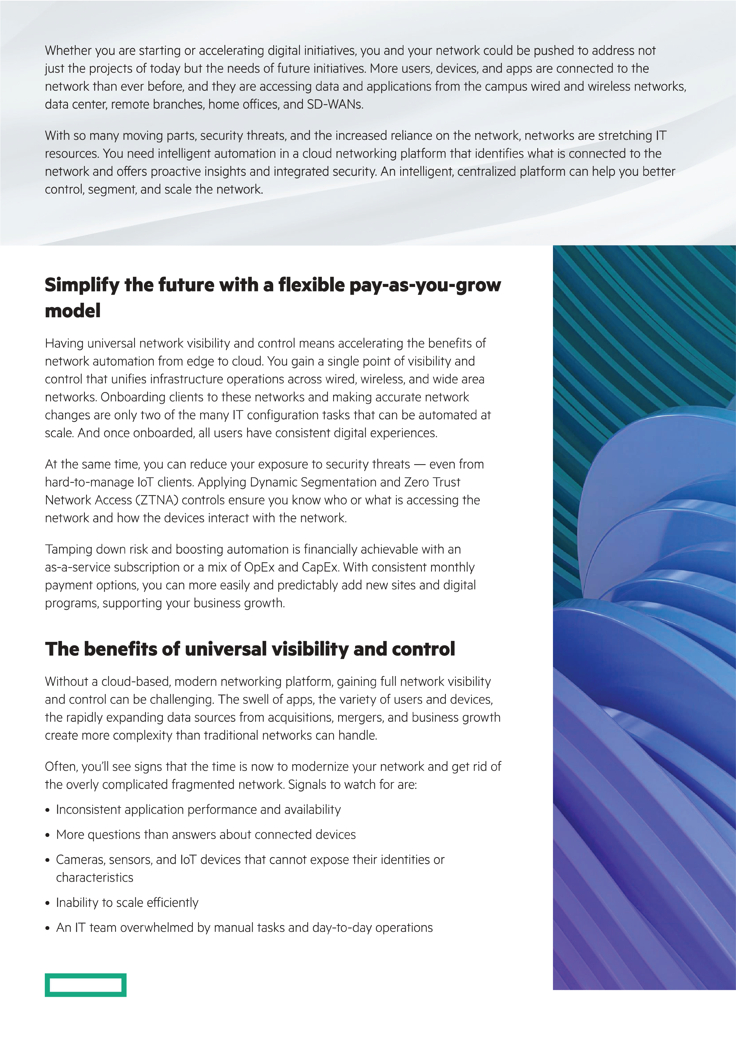 Your organization is more connected than ever, with an increased number of devices, apps, and users accessing data from everywhere. It may seem impossible, but you can achieve full network visibility and control, even across an increasingly complex edge. A secure, modern HPE Aruba Networking solution simplifies operations and lets you manage any size network from edge to cloud, without stretching IT resources too thin.