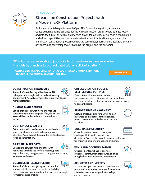 Legacy ERP systems can be complicated and awkward to use. Employees struggle to get the information required to make decisions, spot trends, or react to issues as they arise. Construction leaders must access siloed systems with outdated reports to manage daily activities and create long-term strategic goals.