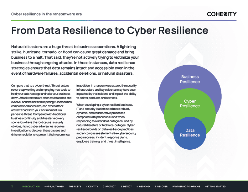 In today’s landscape, cyber threats pose a persistent danger to businesses, unlike natural disasters that eventually pass. To combat this, modern solutions are essential, facilitating global visibility into protected data and enhancing collaboration between IT and Security teams. This eBook explores the 5 keys to developing a cyber resilient business, emphasizing the alignment of Cohesity’s data security and management solutions with the NIST cybersecurity framework. Strengthening cyber resilience becomes crucial for safeguarding businesses against relentless cybercriminal activities.