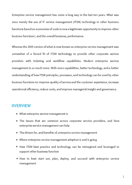 Enterprise service management has come a long way in the last ten years.What was once merely the use of IT service management (ITSM) technology in other business functions based on economies of scale is now a legitimate opportunity to improve other business functions’,and the overall business, performance. Whereas the 2005 version of what is now known as enterprise service management was somewhat of a forced fit of ITSM technology to provide other corporate service providers with ticketing and workflow capabilities.Modern enterprise service management is so much more. With more capabilities, better technology, and a better understanding of how ITSM principles,processes,and technology can be used by other business functions to:improve quality of service and the customer experience,increase operational efficiency, reduce costs,and improve managerial insight and governance.