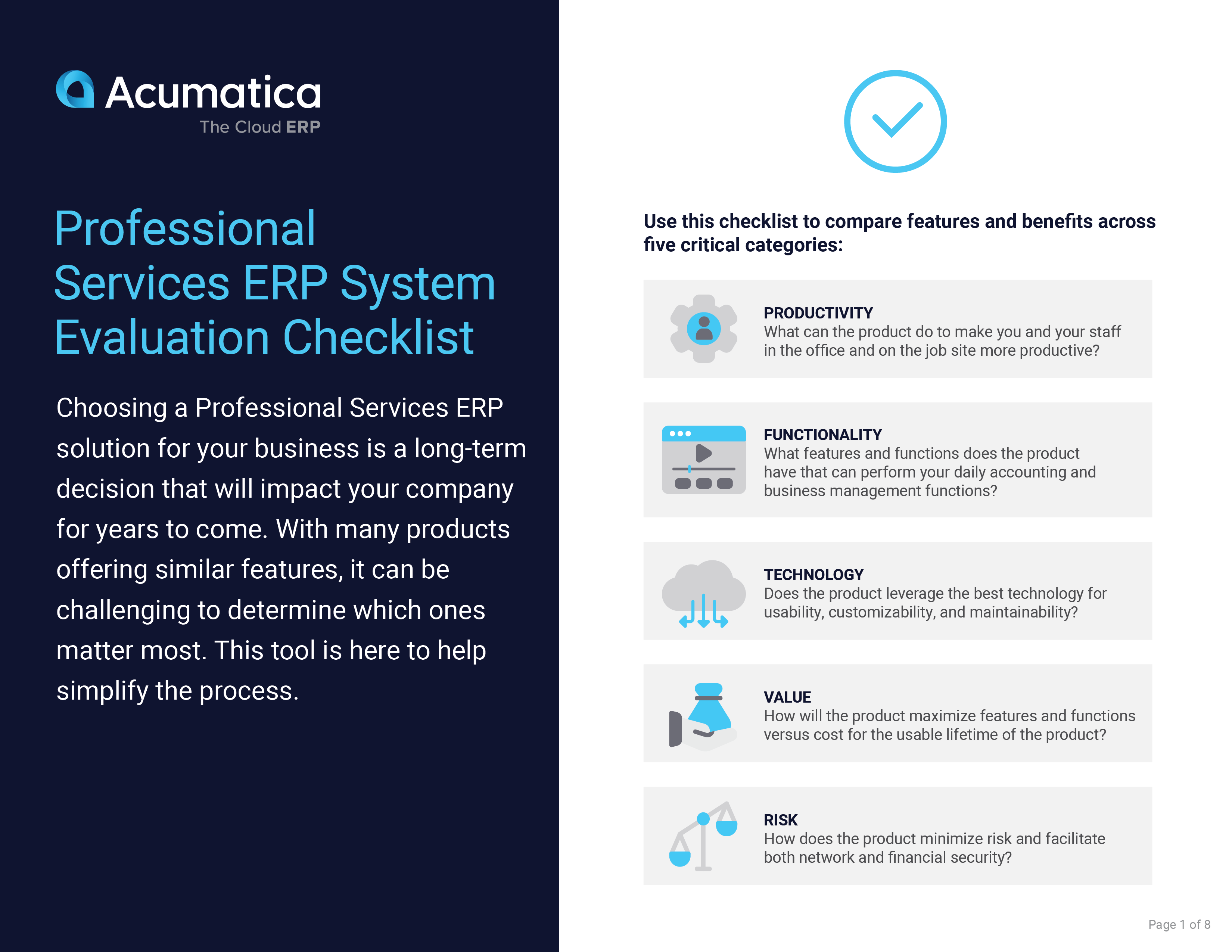 Compare and contrast Professional Services ERP Software with this interactive checklist.Choosing Professional Services ERP Software to run your business is a long-term decision that will impact your company for years to come. It can be challenging to determine which solutions best fit your needs.