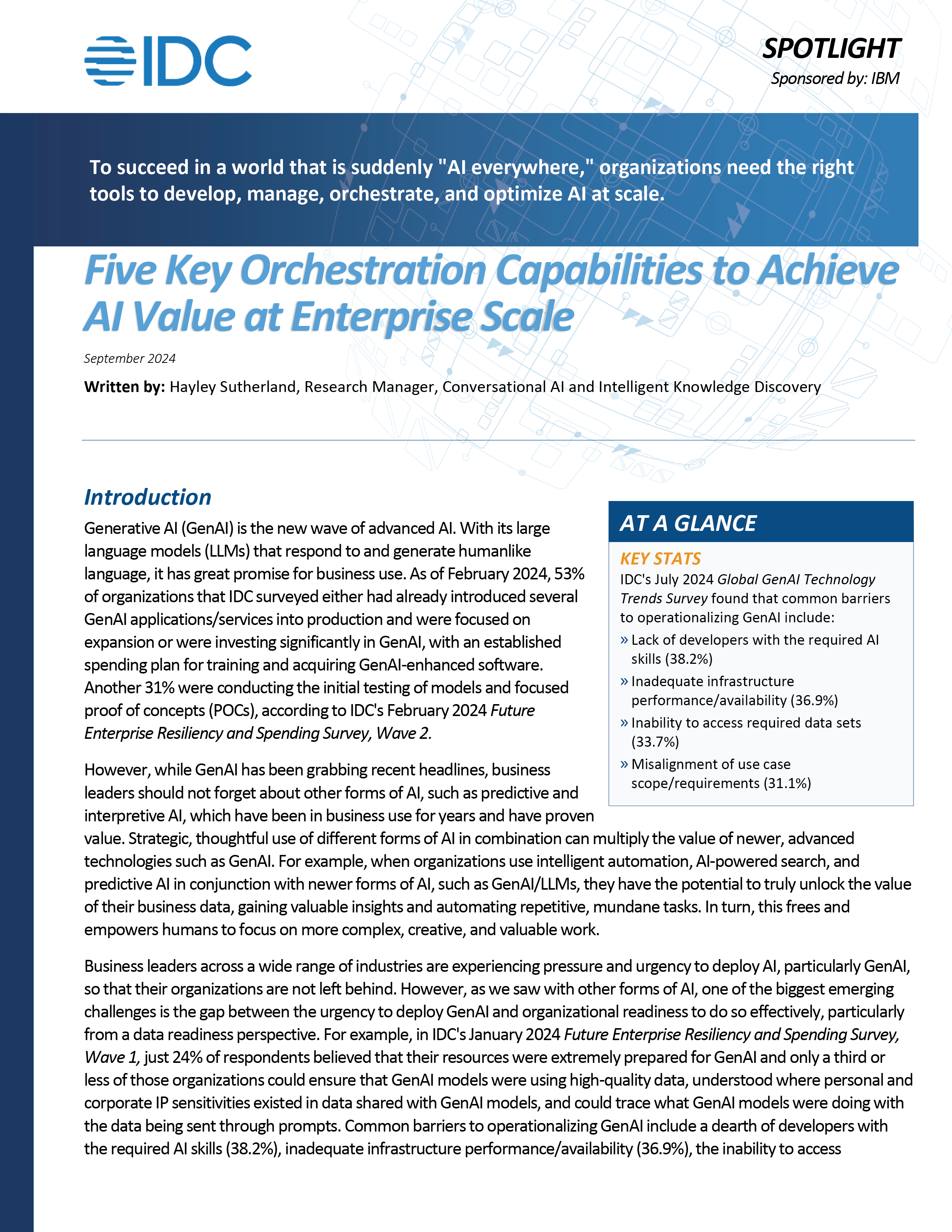Generative AI (GenAI) is the new wave of advanced AI. With its large language models (LLMs) that respond to and generate humanlike language, it has great promise for business use. As of February 2024, 53% of organizations that IDC surveyed either had already introduced several