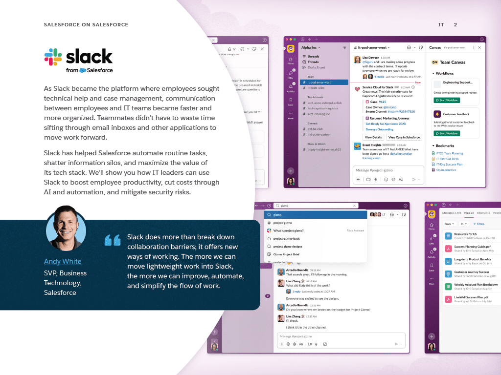 Salesforce leverages Slack to streamline IT operations, empowering teams to maximize productivity and allocate resources to strategic projects. By utilizing Slack’s AI and automation features, Salesforce reduces costs and mitigates security risks. Discover how Salesforce utilizes Slack to enhance productivity, optimize its tech stack for better ROI, and ensure data security with enterprise-grade protections.