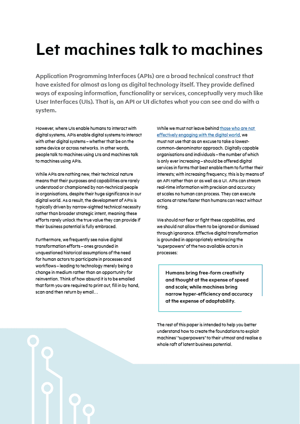 Embracing and understanding Application Programming Interfaces (APIs) across a whole organisation,rather than just within technical teams,is an important part of realising the full value of digital transformation. It is critical to move on from short-sighted API projects driven by technical necessity to strategically aligned efforts that unlock broader business benefits and opportunities.Organisations unable to make this shift are being dragged down by their legacy estate and left behind by the digital-native world.