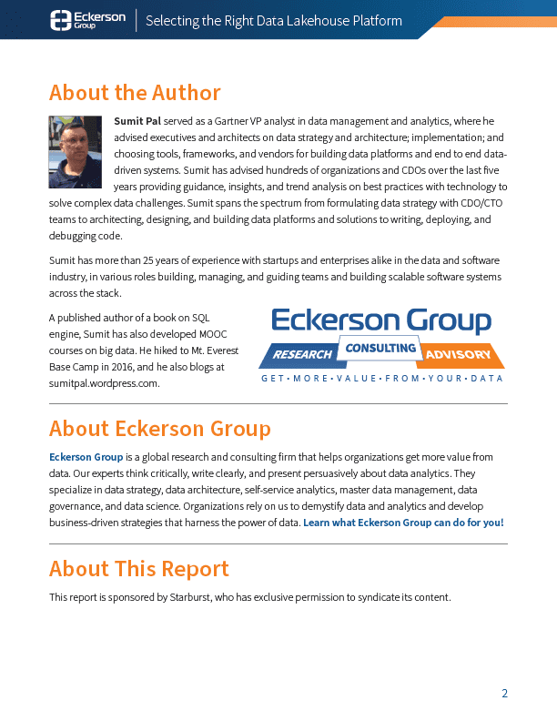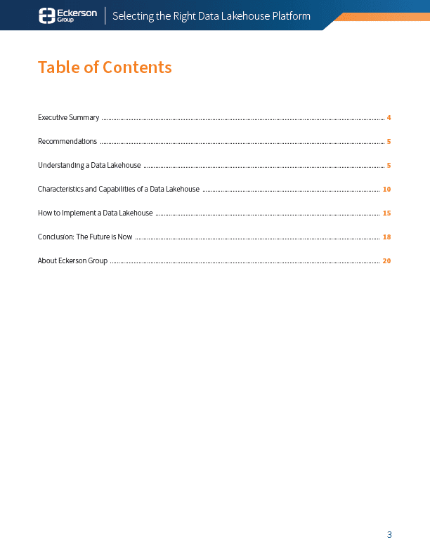 This report by Eckerson Group explores the innovative architecture of data lakehouse platforms, which combine the capabilities of traditional data lakes and data warehouses. It discusses how data lakehouses are transforming data ecosystems, their key features, deployment strategies, and their role in shaping AI and data engineering. Additionally, it provides insights on next-generation data architecture and advice on leveraging data federation capabilities.
