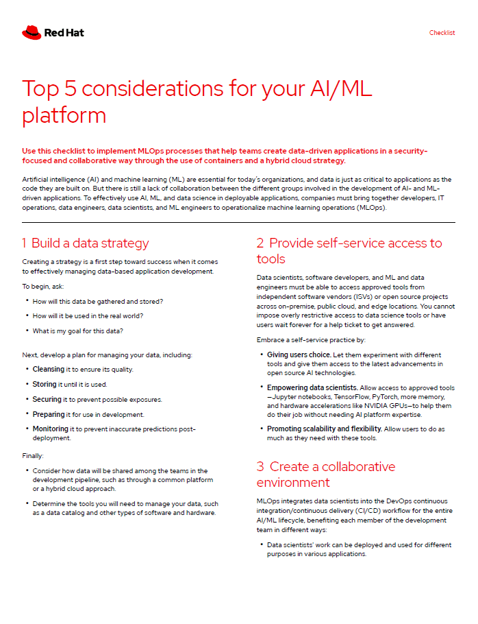 Artificial intelligence (AI) and machine learning (ML) are essential for today’s organizations, and data is just as critical to applications as the code they are built on. But there is still a lack of collaboration between the different groups involved in the development of AI- and ML driven applications. To effectively use AI, ML, and data science in deployable applications, companies must bring together developers, IT operations, data engineers, data scientists, and ML engineers to operationalize machine learning operations (MLOps).