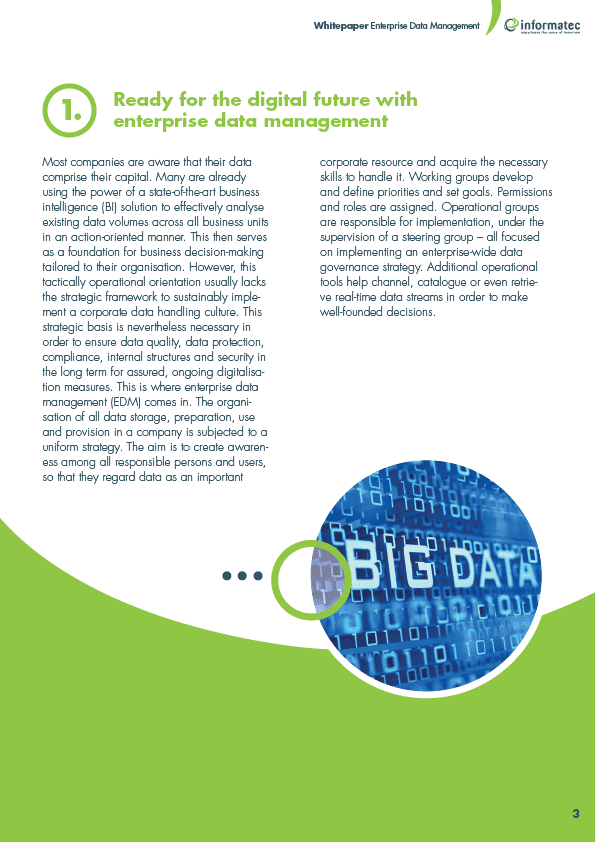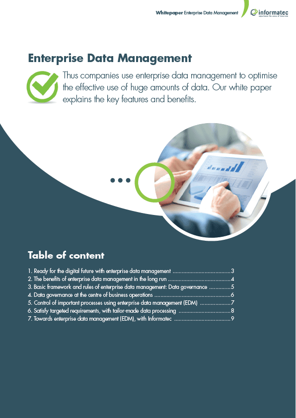 Most companies are aware that their data comprise their capital.Many are already using the power of a state-of-the-art business intelligence (BI) solution to effectively analyse existing data volumes across all business units in an action-oriented manner.This then serves as a foundation for business decision-making tailored to their organisation However, this tactically operational orientation usually lacks the strategic framework to sustainably implement a corporate data handling culture.This strategic basis is nevertheless necessary in order to ensure data quality,data protection, compliance,internal structures and security in the long term for assured,ongoing digitalisation measures.This is where enterprise data management (EDM) comes in.The organisation of all data storage,preparation,use and provision in a company is subjected to a uniform strategy.The aim is to create awareness among all responsible persons and users,so that they regard data as an important.
